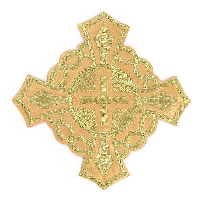 Термоаппликация в форме креста размером 10×10 см представляет собой вышивку металлизированной нитью на синтетической основе. С изнаночной стороны - клеевой слой. Цвет - золото.