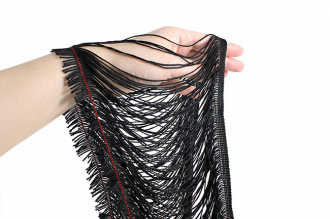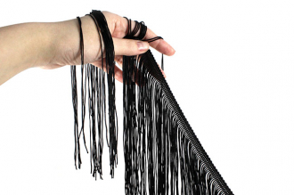 Бахрома доступна в черном цвете. Она идеально подходит для отделки одежды, декора сценических костюмов, а также для украшения головных уборов и элементов интерьера. Представляет собой прочную, плетёную декоративную тесьму с ниспадающими синтетическими нитями. Длина нитей – 20 см.