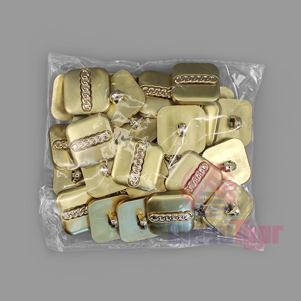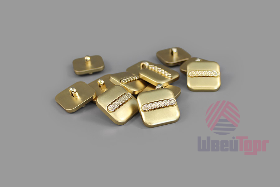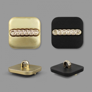 Пуговица имеет привлекательный дизайн – матовая однотонная основа, которую украшает объёмный элемент в центральной части в виде цепи. Оригинальный элемент для яркого образа. Пуговица представлена в четырёх цветах: молоко, чёрный, коричневый золото.