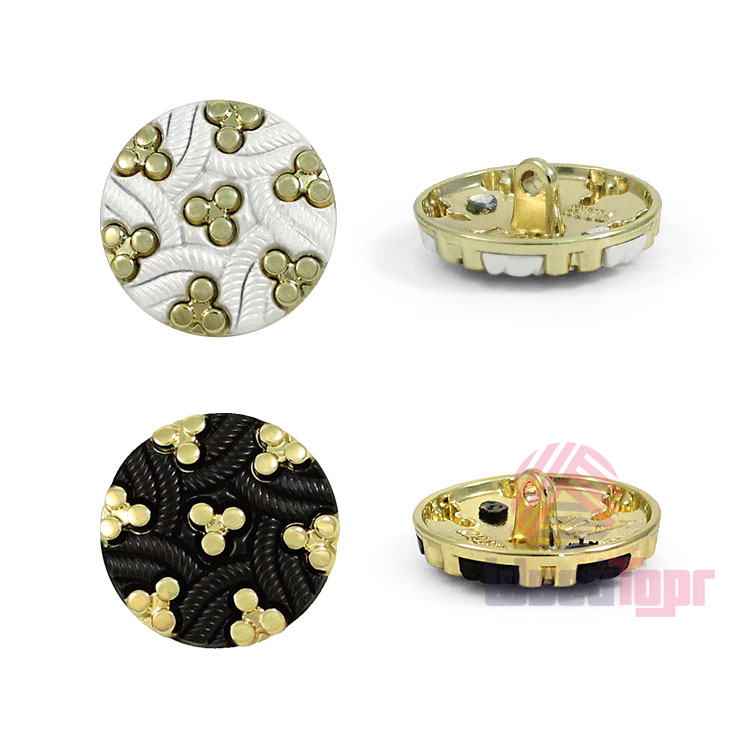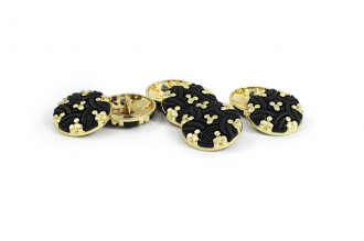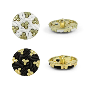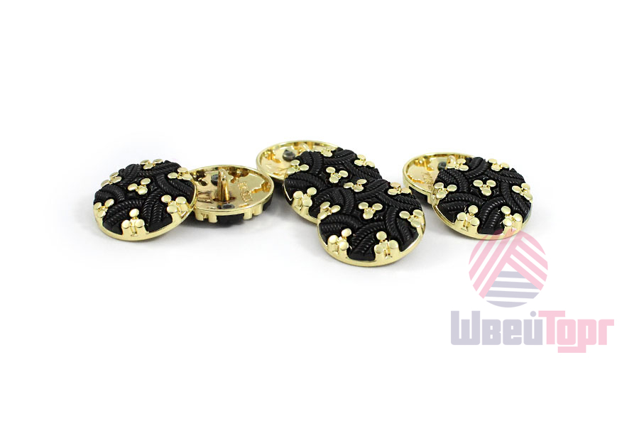 Эта металлическая пуговица на ножке приятно удивляет своим малым весом, сочетающимся с ощутимой прочностью. Её главная особенность – выразительный декор: фактурные переплетающиеся элементы из чёрного пластика контрастируют с яркими золотистыми вставками, создавая динамичный и запоминающийся облик.