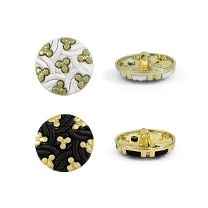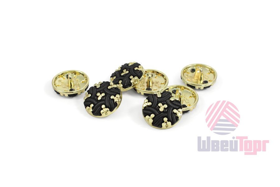 Эта металлическая пуговица на ножке приятно удивляет своим малым весом, сочетающимся с ощутимой прочностью. Её главная особенность – выразительный декор: фактурные переплетающиеся элементы из чёрного пластика контрастируют с яркими золотистыми вставками, создавая динамичный и запоминающийся облик.