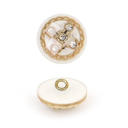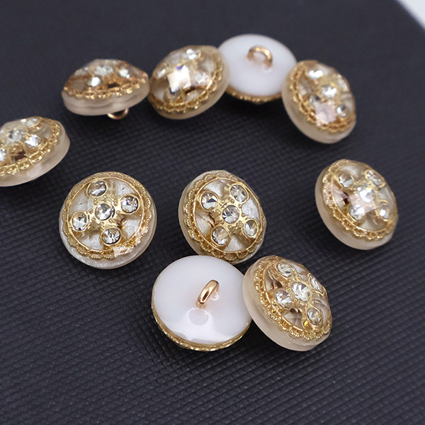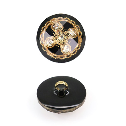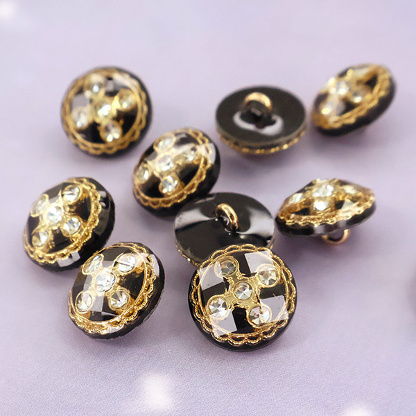 Внутри прозрачной акриловой полусферы с красивыми гранями скрывается настоящее сокровище — композиция из пяти искрящихся страз. Камни заключены в изящное обрамление: тонкое золотое кольцо с филигранным орнаментом, что придает пуговице особую драгоценную эстетику.