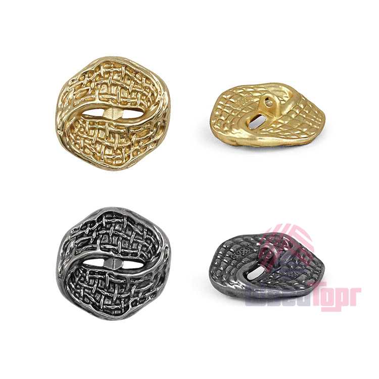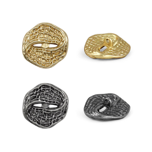 Эта металлическая пуговица на ножке привлекает внимание своим уникальным дизайном. Пуговица напоминает плоское перекрученное кольцо, дополненное выразительной фактурной поверхностью. Дизайн пуговицы – это баланс смелой оригинальности и сдержанного минимализма. Такие пуговицы станут идеальной стильной деталью для жакета или костюма, добавляя образу индивидуальности и современное звучание.