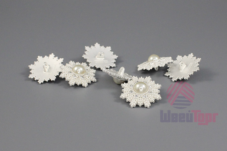Металлическая пуговица на ножке, диаметр 25 мм. Пуговица имеет оригинальную форму и дизайн – резная снежинка, украшенная крупной перламутровой бусиной в центре.