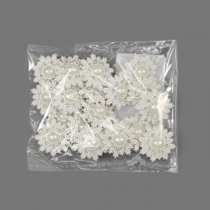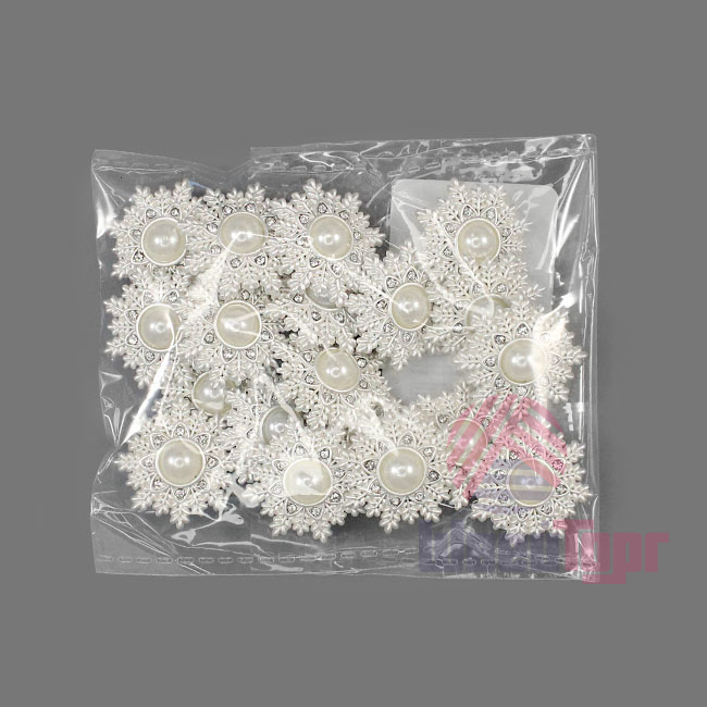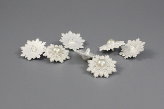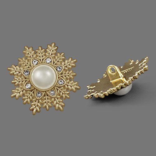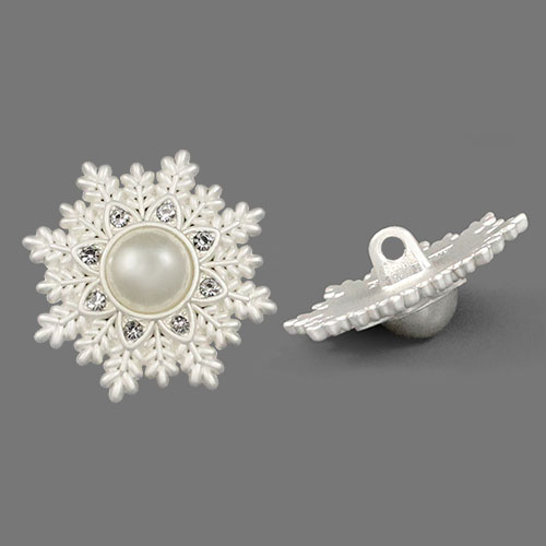 Металлическая пуговица на ножке, диаметр 20 мм. Пуговица имеет оригинальную форму и дизайн – резная снежинка, украшенная крупной перламутровой бусиной в центре.