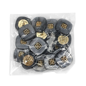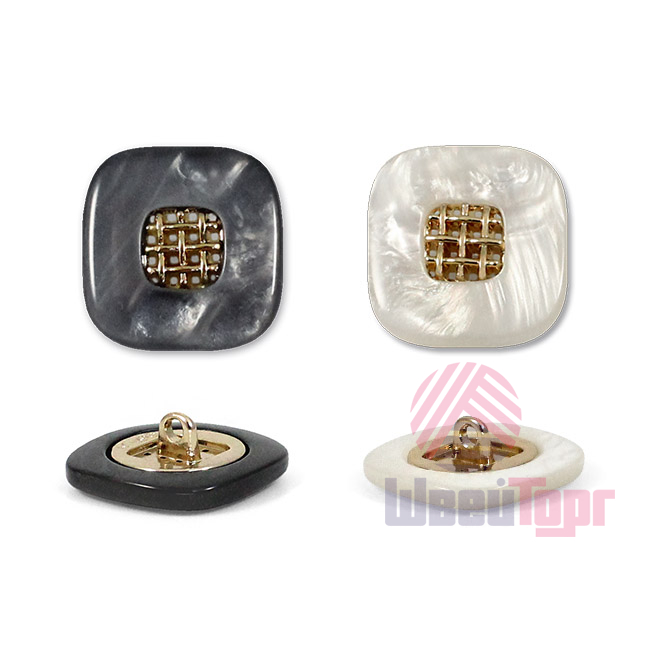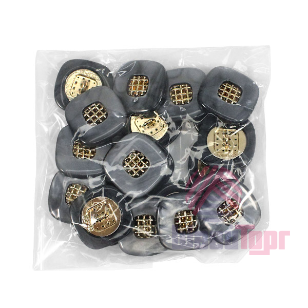 Эта пуговица из пластика с лёгким перламутровым эффектом привлечёт внимание изящной деталью: в центре квадрата, с мягко скруглёнными углами, расположена изысканная золотая решётчатая вставка.