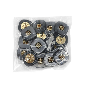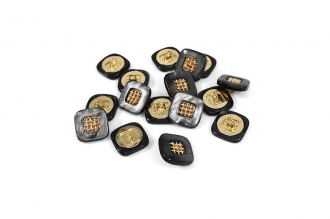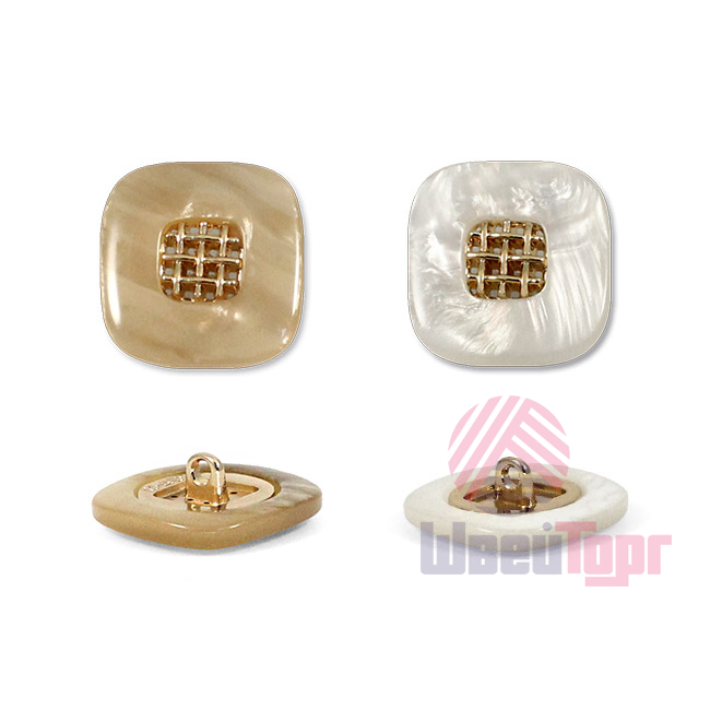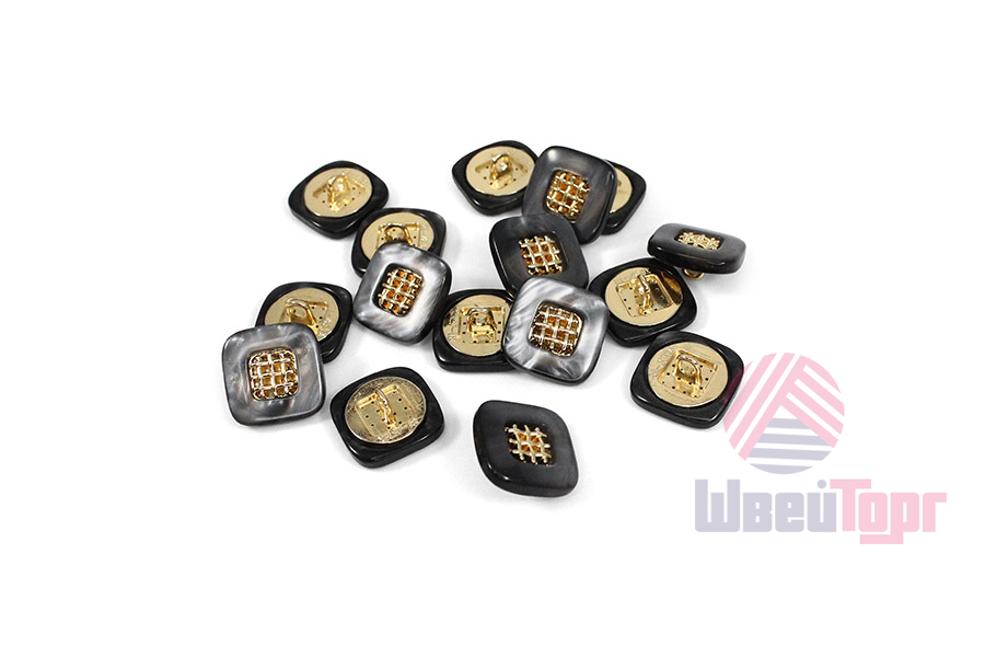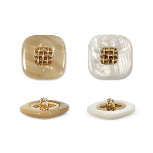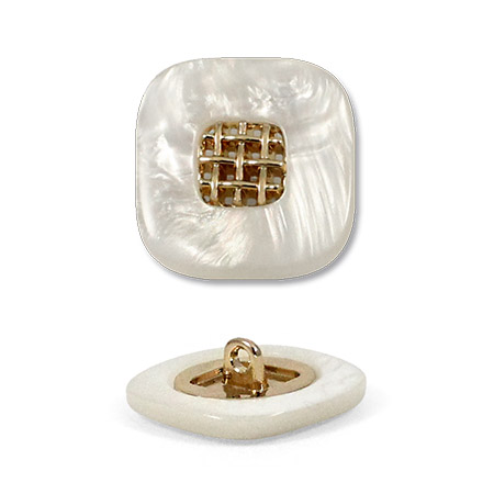 Эта пуговица из пластика с лёгким перламутровым эффектом привлечёт внимание изящной деталью: в центре квадрата, с мягко скруглёнными углами, расположена изысканная золотая решётчатая вставка.