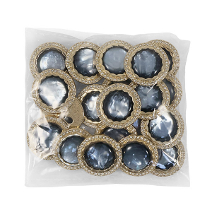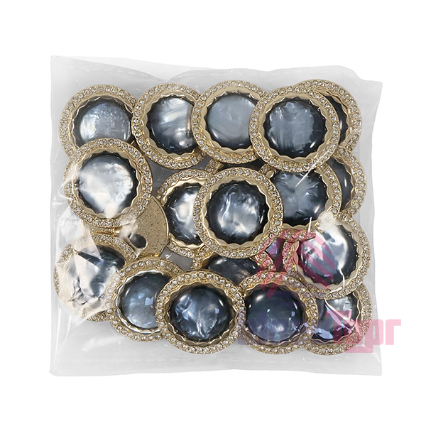 Эта металлическая пуговица диаметром 22 мм на удобной ножке, станет яркой деталью для вашего жакета или костюма. Её золотистая основа по краю украшена россыпью мелких стразов, а центральная выпуклая вставка из акрила, переливающаяся перламутром, добавляет объём и игру света.