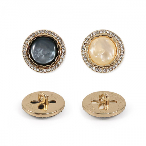 Эта металлическая пуговица диаметром 17 мм на удобной ножке, станет яркой деталью для вашего жакета или костюма. Её золотистая основа по краю украшена россыпью мелких стразов, а центральная выпуклая вставка из акрила, переливающаяся перламутром, добавляет объём и игру света.