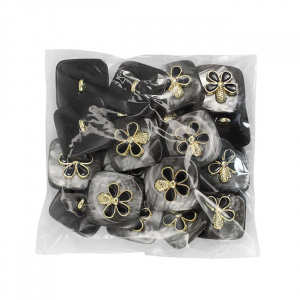 Пластиковая пуговица на ножке для создания милого и стильного образа. Пуговица имеет привлекательный дизайн – глянцевая, перламутровая основа с эффектом разводов, которую украшает объёмный металлический элемент, в центральной части, в виде цветка. Оригинальный элемент для яркого образа. Пуговица представлена в двух цветах: чёрный и нежный кремовый.