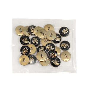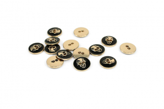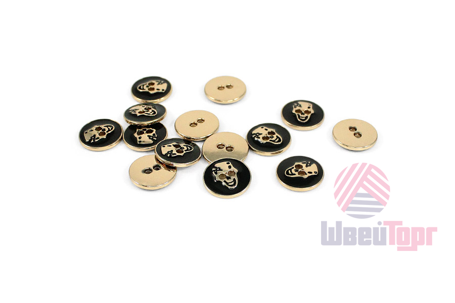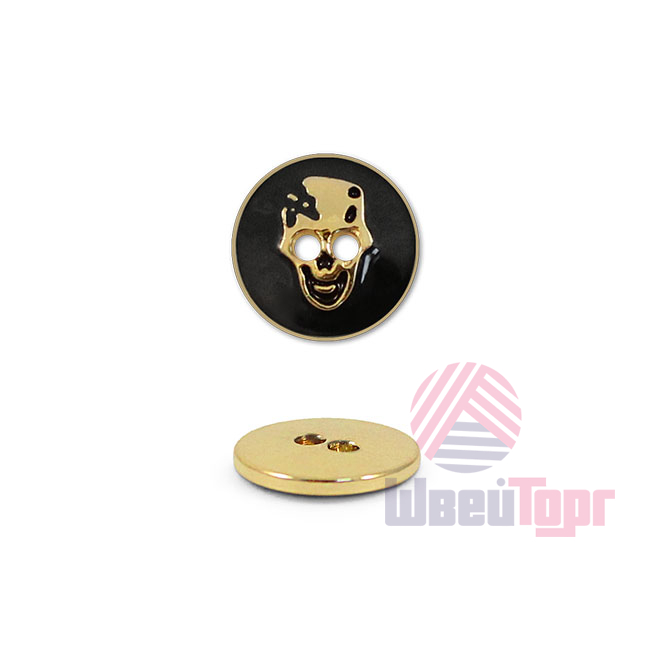 Эта металлическая пуговица на два прокола обладает ярким характером. Её глянцевую чёрную поверхность украшает контрастный золотистый гравированный череп, где глазницы служат функциональными отверстиями для пришивания пуговицы.