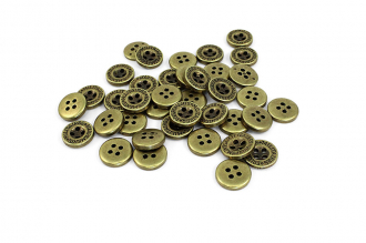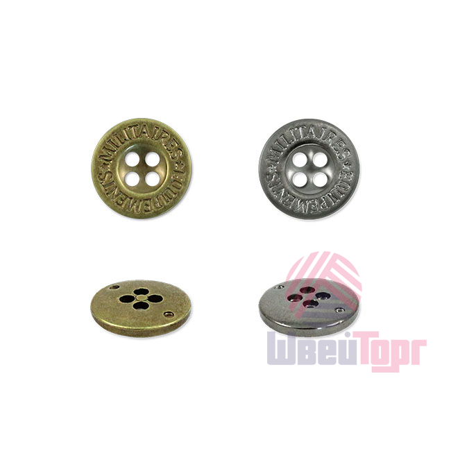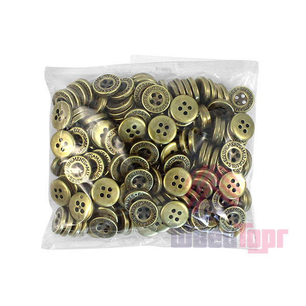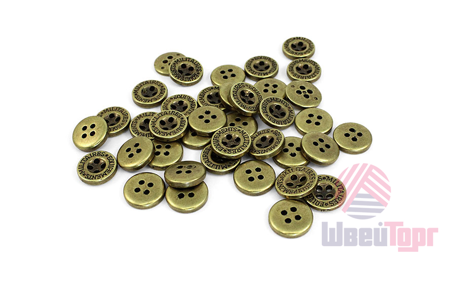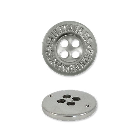 Эта пластиковая пуговица с эффектной металлической имитацией обладает лёгким весом, что делает её практичной в пришивании и комфортной в носке. Классическая круглая форма с четырьмя отверстиями и лаконичным углублением в центре дополнена контурной гравировкой «MILITAIRES EQUIPEMENTS».