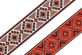 Данная жаккардовая тесьма обладает высокой прочностью, устойчива к растяжению и истиранию. Так как рисунок формируется непосредственно в процессе плетения, что придаёт тесьме эффект вышивки, тесьма сохраняет яркость цветов и не теряет своего внешнего вида долгое время. Рельефный узор тесьмы представляет собой народный орнамент. Благодаря высококачественному полиэстеру, из которого она изготовлена, тесьма сохраняет насыщенность цветов даже при частом использовании.