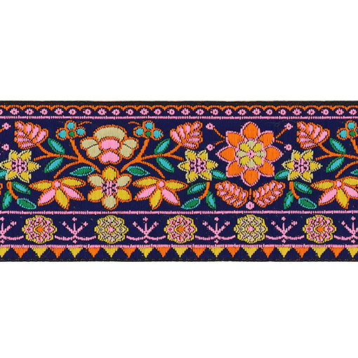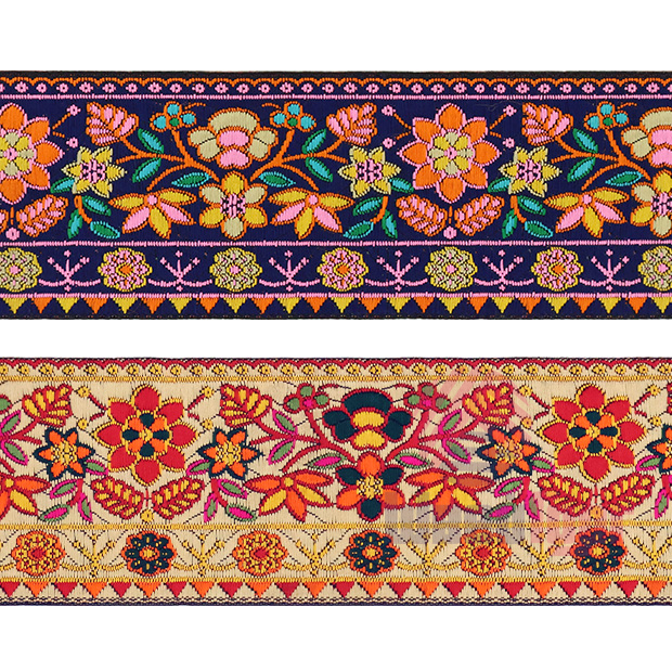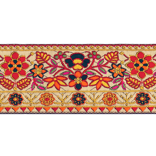 Данная жаккардовая тесьма обладает высокой прочностью, устойчива к растяжению и истиранию. Так как рисунок формируется непосредственно в процессе плетения, что придаёт тесьме эффект вышивки, тесьма сохраняет яркость цветов и не теряет своего внешнего вида долгое время. Рельефный узор тесьмы представляет собой геометрический орнамент. Благодаря высококачественному полиэстеру, из которого она изготовлена, тесьма сохраняет насыщенность цветов даже при частом использовании.