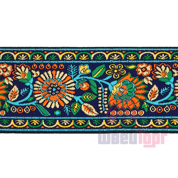 Данная жаккардовая тесьма обладает высокой прочностью, устойчива к растяжению и истиранию. Так как рисунок формируется непосредственно в процессе плетения, что придаёт тесьме эффект вышивки, тесьма сохраняет яркость цветов и не теряет своего внешнего вида долгое время. Рельефный узор тесьмы представляет собой геометрический орнамент. Благодаря высококачественному полиэстеру, из которого она изготовлена, тесьма сохраняет насыщенность цветов даже при частом использовании.